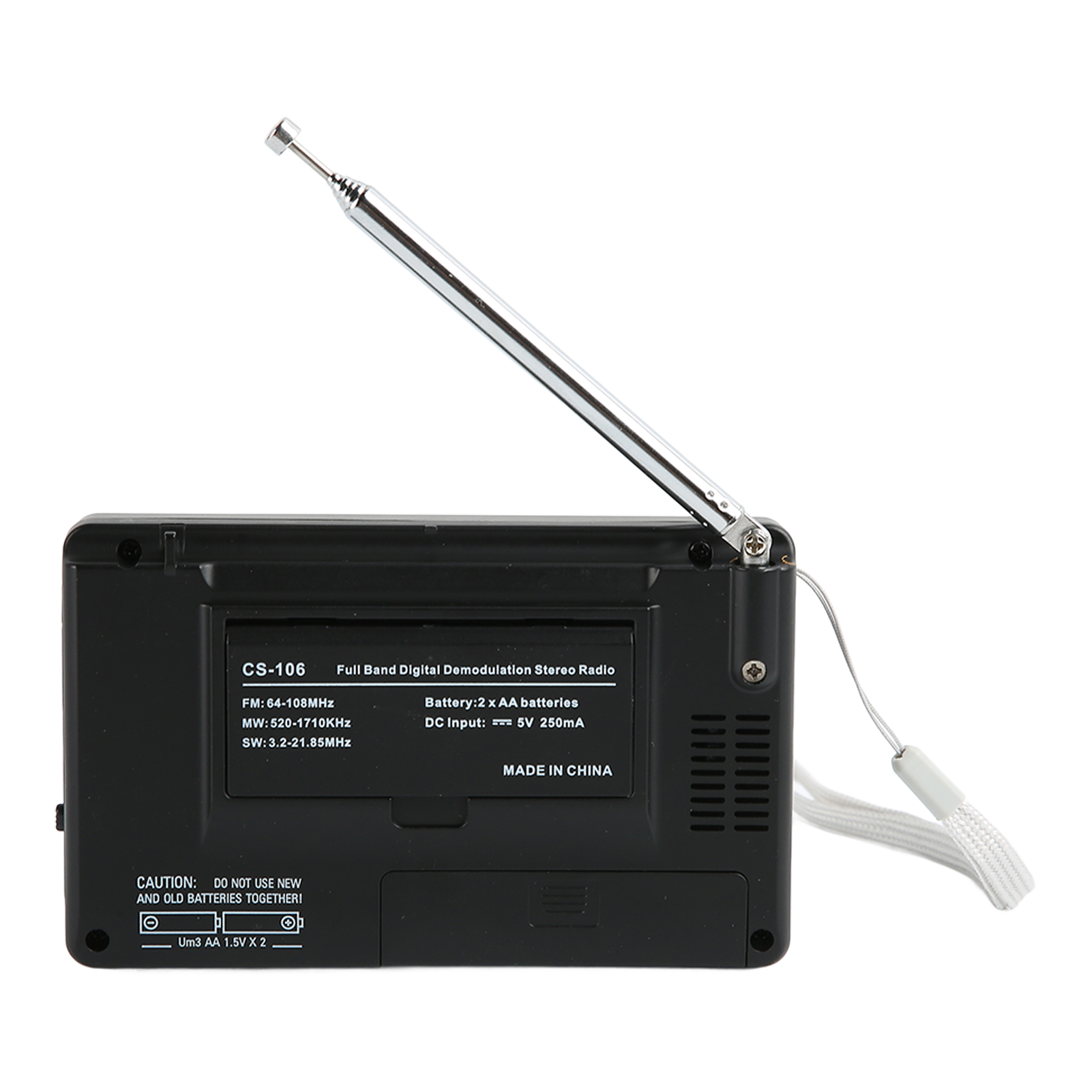 Портативный FM-радиоприемник с антенной CS-106 позволяет прослушивать радиостанции в диапазонах AM(MV)/SW/FM. Имеет телескопическую антенну, которая обеспечивает уверенный прием даже при слабом сигнале!